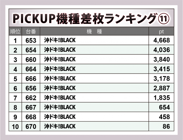 『沖ドキ!BLACK』20台ではピッタリ半分の10台が勝利。+4千超×2・+3千超×3&+2千9百弱・+1千8百超が1台ずつと、勝負に値するエリアだったのは間違いない。