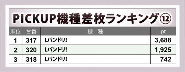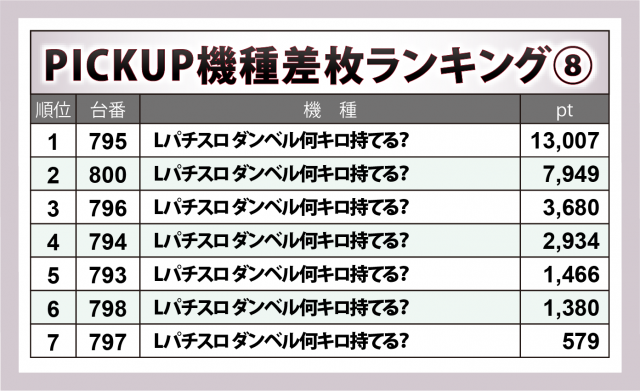 この週頭に導入された『Lパチスロ ダンベル何キロ持てる?』11台もハイグレード。795番台が+1万3千超、+7千9百超・+3千7百弱・+2千9百超が1台ずつ&+1千超×2と追随し、デビュー直後にかかわらず鮮烈な活躍を見せた。