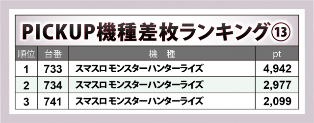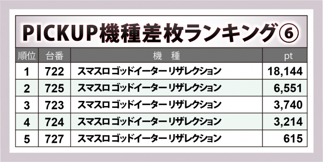『スマスロ ゴッドイーター リザレクション』7台では722番台が+1万8千1百超で全401台の王座に君臨したのに加え+6千6百弱×1・+3千超×2と、盛況度では他機種に引けを取らなかった。