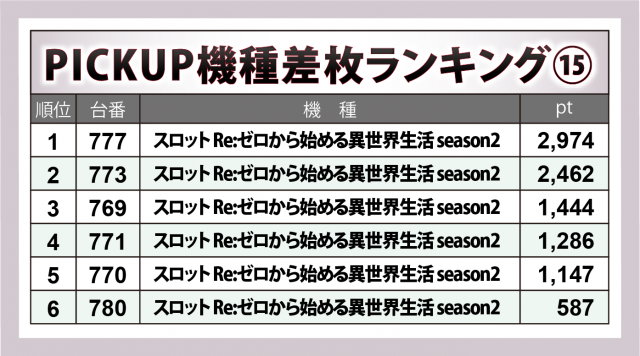 『スロット Re:ゼロから始める異世界生活 season2』12台もちょうど半数の6台がプラス。うち5台が4桁プラスをマークしたが、+3千の壁を超えていればなお良かった。