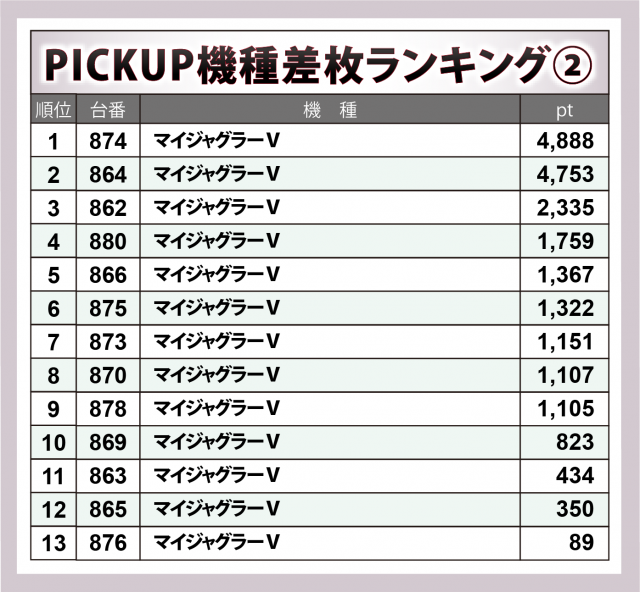 『マイジャグ』20台も『ゴージャグ』同様に5割を超える台が勝利。874番台が+4千9百弱・864番台が+4千8百弱と、ボーナスタイプの潜在能力を十二分に解放し、他にも+2千3百超×1・+1千超×6と、チャンスが秘められていたコーナーだったことが読み取れる。