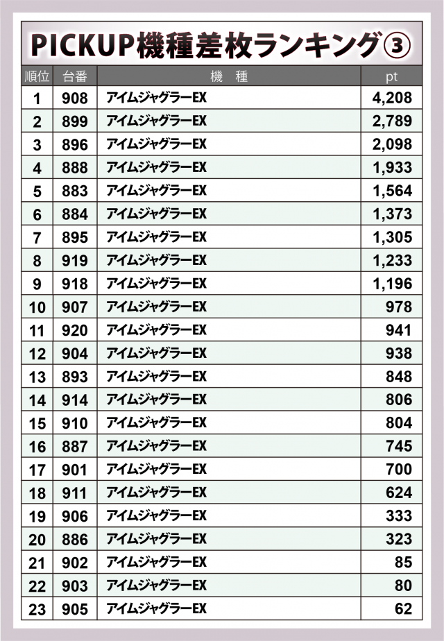 『アイムジャグ』40台も上2機種に対抗し半数超のプラス率を実現。908番台が+4千2百超を計上し、+2千超×2・+1千超×6と、勝機が多く見受けられた。