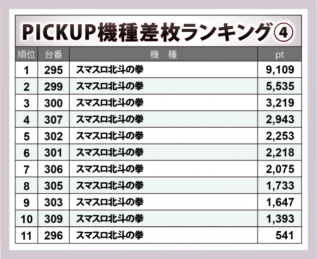 『スマスロ北斗』20台も半数超がプラスに成功。295番台の+9千1百超を筆頭に+5千5百超・+3千2百超が1台ずつ、+2千超×4・+1千超×3と、大勝利への道が拓かれていた。