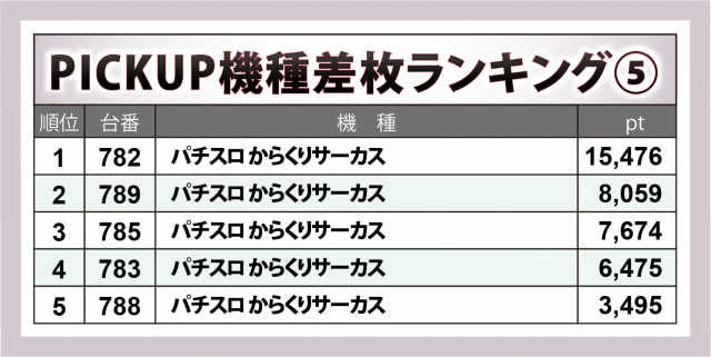 過去3回クオリティの高さが際立っていた『パチスロ からくりサーカス』9台はまたもやプラスを成立した5台全てが4桁以上の数値を成し遂げる高品質。782番台の+1万5千5百弱を皮切りに+8千1百弱・+7千7百弱・+6千5百弱・+3千5百弱が1台ずつと、店内随一の盛り上がりを誇った。