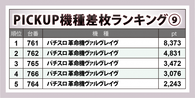 もはやベテランと言っても差し支えない『パチスロ 革命機ヴァルヴレイヴ』8台もハイクラス。761番台が+8千4百弱、その後にも+4千8百超・+2千2百超が1台ずつ&+3千超×2と続き、流石の貫録を見せつけた。