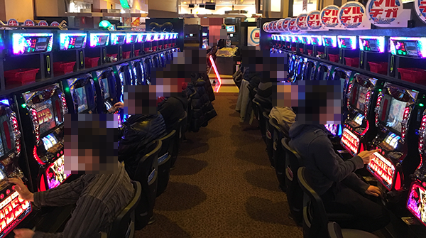 開店直後の20円パチスロでは、新台の「押忍!番長3」や「バジリスク~甲賀忍法帖~絆」など、多数の機種が満席。