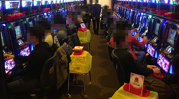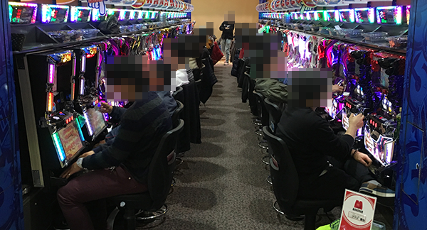 4円パチンコでは、「ぱちんこCR真・北斗無双」や「CRぱちんこ GANTZ」など、多くの機種が盛況。シマ内に広がる華やかな光景は、満足度の高さをあらわしているようであった。