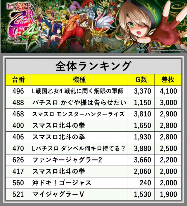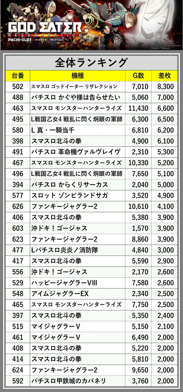 厳選された取材対象機種をはじめ、その他スロット全体から好記録が飛び出した!プレイヤーが楽しんだ1日を下記データにて振り返ってみて欲しい。