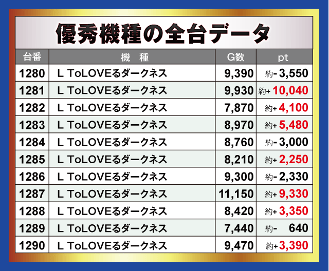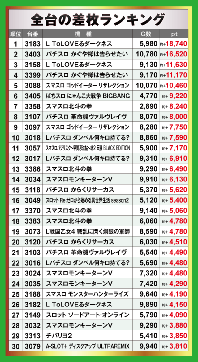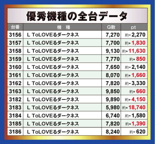 楽園上新屋店のPICK UP機種は『L ToLOVEるダークネス』。全13台中8台がプラス差枚で終了している上に、3183番台が怒涛の+18,000pt超、3158番台が+11,000pt超と万枚超が複数発生する盛況ぶりを見せていた。しかも、平均差枚が+2,300pt超となっており、ファンとって充実の一日になったのは間違いないだろう。