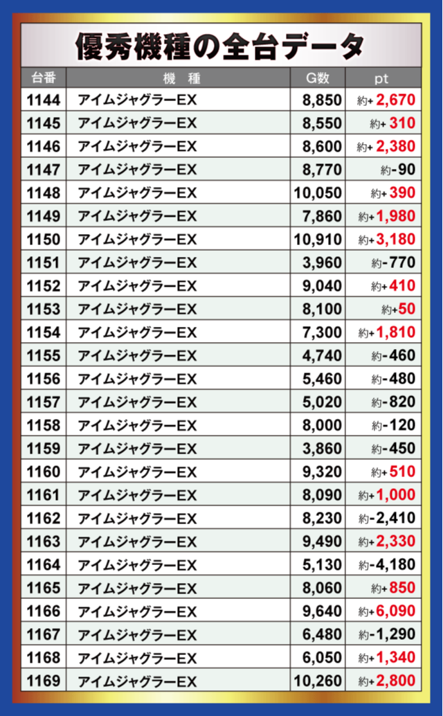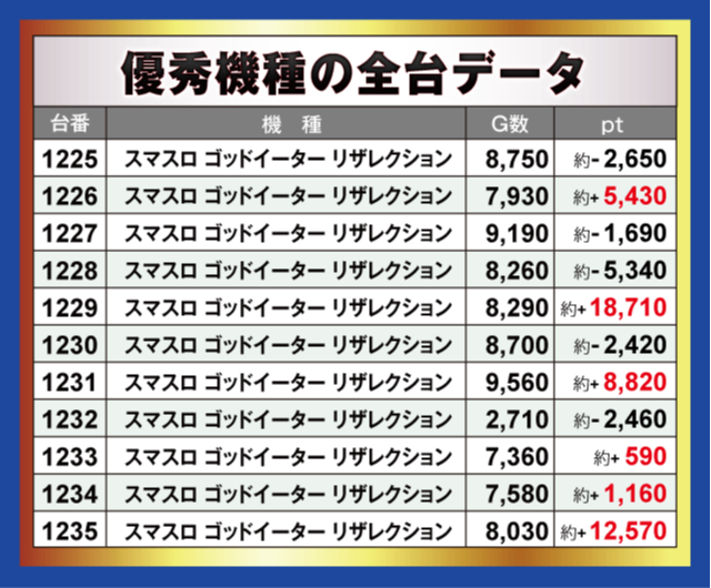 一方、楽園浜松ザザシティ店のPICK UP機種は全5機種。特に目立っていたのが『スマスロ ゴッドイーター リザレクション』で、1229番台の+18,000pt超に1235番台の+12,000pt超と、実にハイレベルな記録が連発している。また、Aタイプながら『アイムジャグラーEX』も大奮闘しており、1166番台の+6,000pt超を筆頭に全26台中16台がプラス差枚という見事な結果を残した。