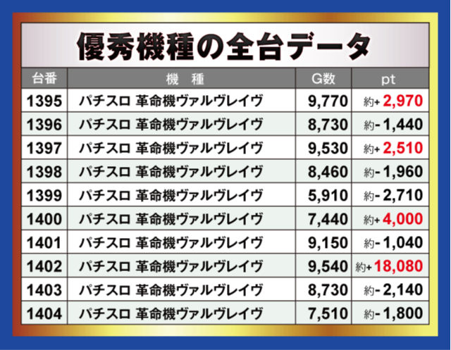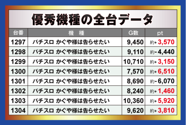 朝から300人以上のプレイヤーが集まり列を作った楽園上新屋店では、PICK UP機種以外からも夢の万枚超が複数発生。なかでも『パチスロ かぐや様は告らせたい』が+16,000pt超&+11,000pt超を叩き出し店内を盛り上げていた。さらに、『スマスロ北斗の拳』や『パチスロ 革命機ヴァルヴレイヴ』の+8,000pt超など、定番の人気機種がしっかり活躍している点も見逃せないポイントと言えるだろう。