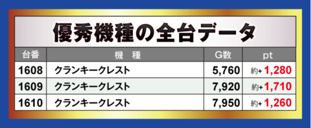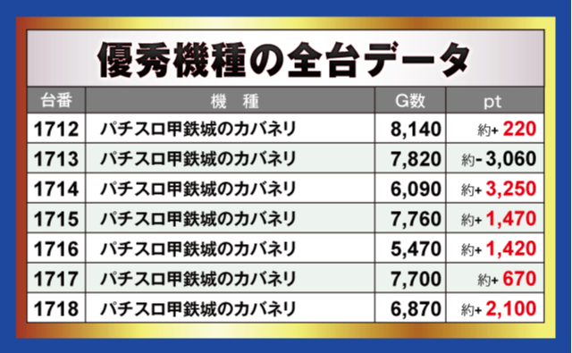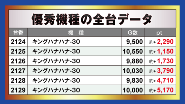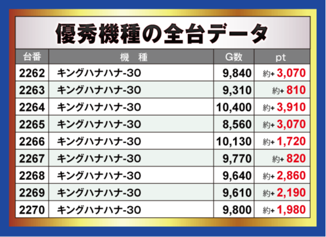 一方、楽園袋井店のPICK UP機種は全3機種。『キングハナハナ-30』で+5,000pt超、『パチスロ甲鉄城のカバネリ』で+3,000pt超といった好成績を確認できた。しかも、3機種トータルの全16台中15台がプラス差枚で実戦を終えているだけに、各シマは常に活気に満ち溢れファンの笑顔が絶えない一日となった。