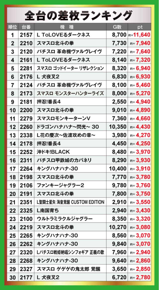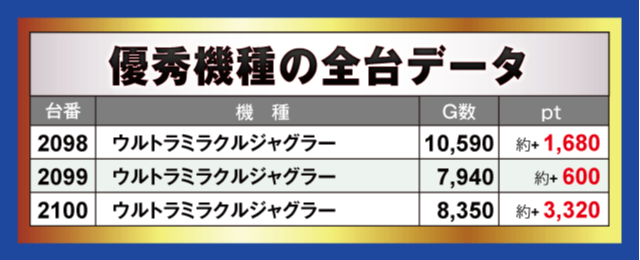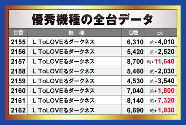 楽園沼津店のPICK UP機種は全5機種。特に目立っていたのが『L ToLOVEるダークネス』で、+11,000pt超に+7,000pt超が発生する盛況ぶりを見せていた。また、『キングハナハナ-30』と『ウルトラミラクルジャグラー』は+3,000pt超が続出している上に全台がプラス差枚で終了するという見事な結果を残している。