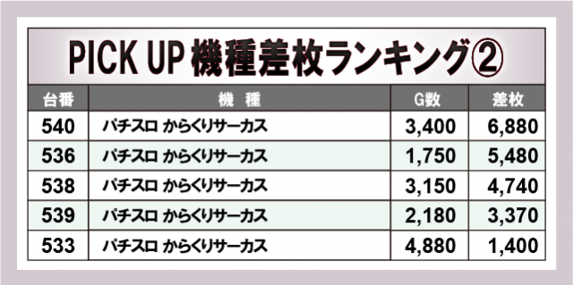 上表で取り上げている5機種は、いずれも大きな熱気を生み出している。スマスロ機から『スマスロ北斗の拳』『パチスロ からくりサーカス』『スマスロモンキーターンV』『スマスロ ゴッドイーター リザレクション』は人気機種ならではの、さすがのひと言に尽きるパフォーマンスを披露。また、ノーマルタイプの『マイジャグラーⅤ』も負けじとポテンシャルを解放していた様子が窺え、店内の盛り上がりに貢献していた機種と言える。