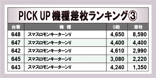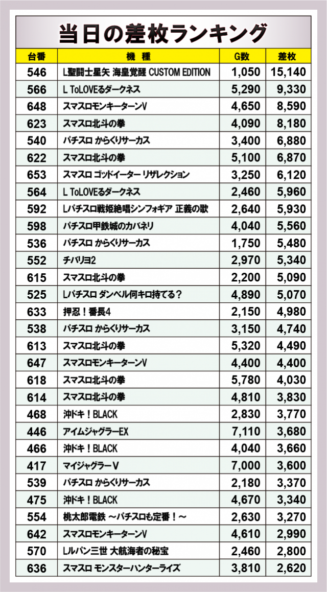 万枚達成台は『L聖闘士星矢 海皇覚醒 CUSTOM EDITION』となっており、さらに『L ToLOVEるダークネス』『スマスロモンキーターンV』『スマスロ北斗の拳』と人気機種が追随!また、半数近くで5,000枚OVERを達成していることから、高い実力がハッキリと窺えるばかりだ。チャンスは至る所に存在していた証でファンは確信を持ってレバーを叩いていたことだろう。