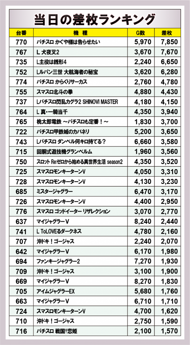 上表の通り、『パチスロ かぐや様は告らせたい』『L 犬夜叉2』で7,000枚OVERが発生。さらに『L主役は銭形4』『Lルパン三世 大航海者の秘宝』で6,000枚OVERと気を吐き、これらが店内の熱気を引き上げていた。他にもまとまった出玉を確保する台を確認でき、遊技していたファンはコンスタントなボーナス当選に恍惚の表情を浮かべていたことだろう。