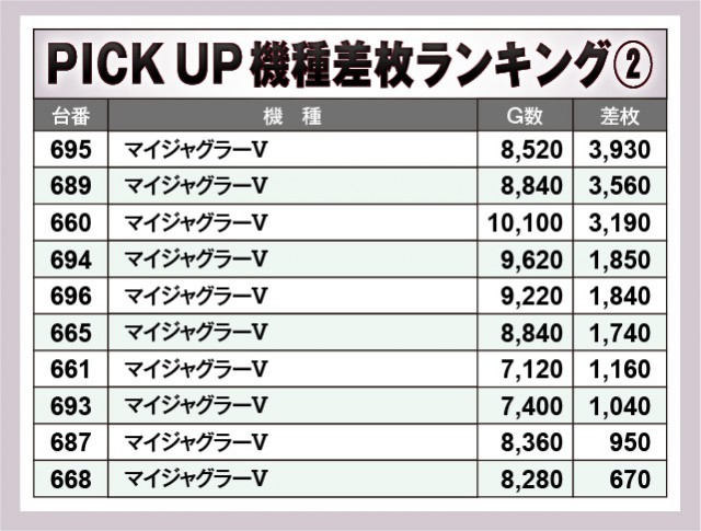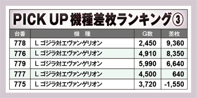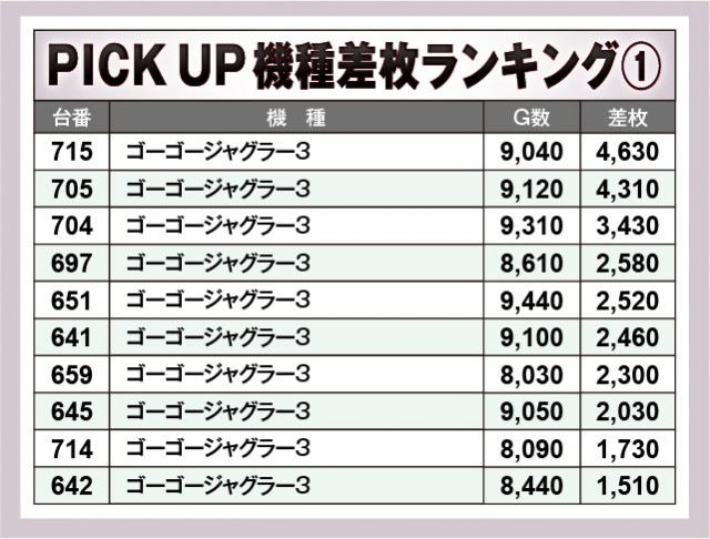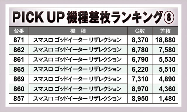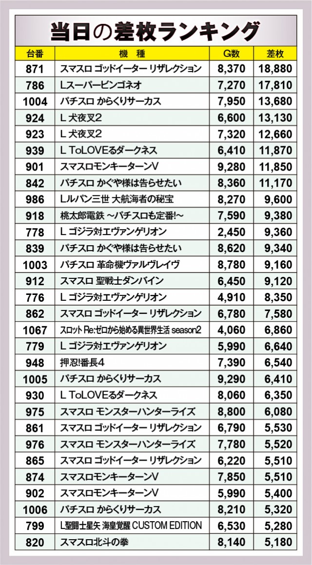 『ゴーゴージャグラー3』『マイジャグラーⅤ』はAT機の盛り上がりに負けず、コンスタントにボーナス当選を披露していた様子だ。後者は万回転OVERを達成しており、閉店まで打ち倒されていたのが鮮烈である。もちろん万枚OVERを達成した『スマスロモンキーターンV』『スマスロ ゴッドイーター リザレクション』も大きな存在感を放っており、優秀機種が中心となって盛り上がりを形成していたと言える。