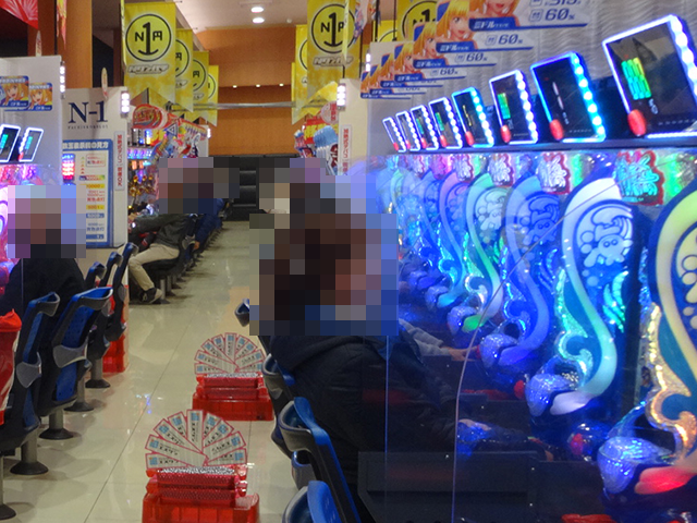 プレイヤーが1箱以上や5箱以上の持ち玉を使い、うれしそうに遊技をおこなっていた。