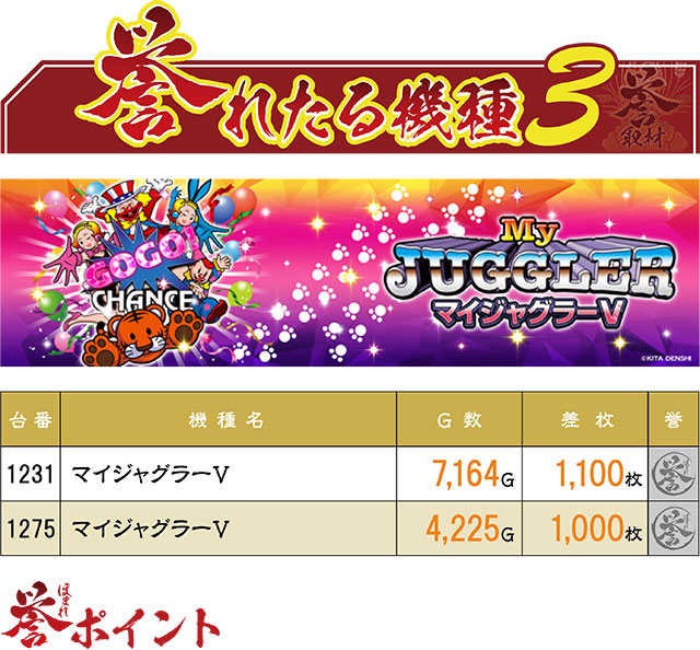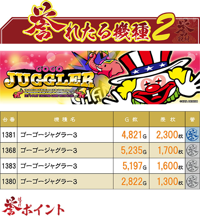 4台の誉レコードを生み出したのは『ゴーゴージャグラー3』。残念ながら3,000枚を超える結果には出会えなかったが、ジャグラーファンたちを満足させることはできたようだ。