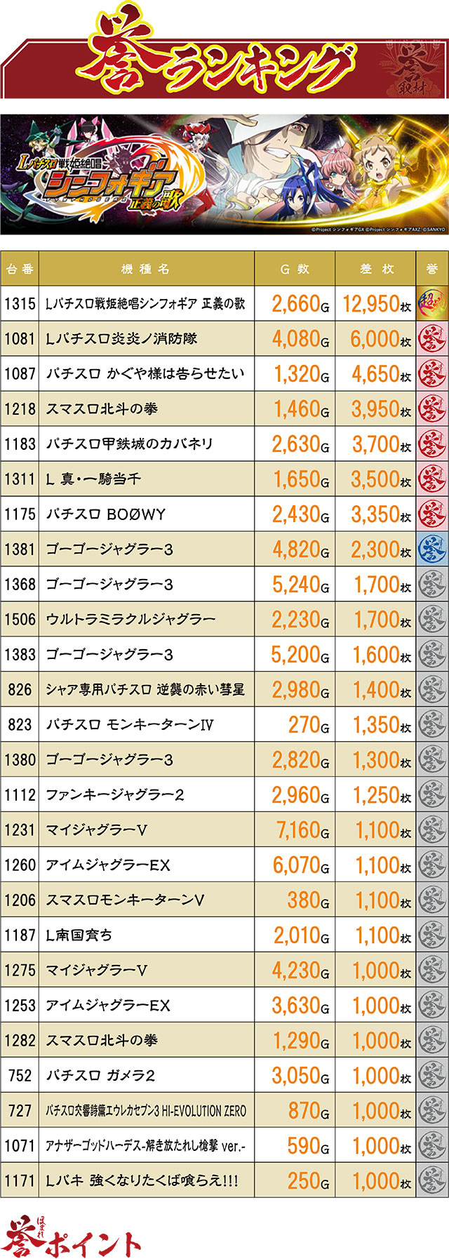 12,000枚超えという文句なしの差枚結果でこの日の1位記録に輝いたのは、『Lパチスロ戦姫絶唱シンフォギア 正義の歌』。直近3回の誉取材では、いずれも7,000枚を超える結果が生まれていなかったため、年の瀬に大きな飛躍を見せつける結果となった!