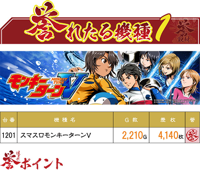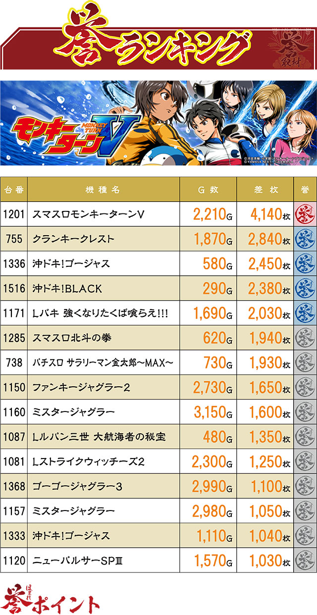 今回、パチスロコーナーの最高差枚を叩いたのは、おなじみ『スマスロモンキーターンV』。赤誉マーク(=3,000枚以上)にはなっていたものの、『モンキー』にしてはやや物足りなさも否めない結果に。2位以下の記録には、Aタイプ機種たちが多くランクイン!