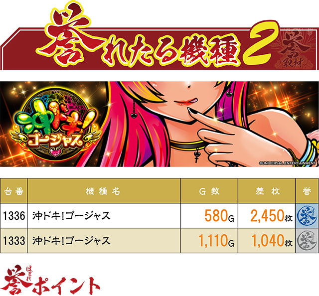 7台設置の『沖ドキ!ゴージャス』からは、2台の誉レコードが誕生。勝率こそ4/7台とまずまずな結果だが、やはり総ゲーム数不足が記録の伸びを妨げているのが明白となっていた。