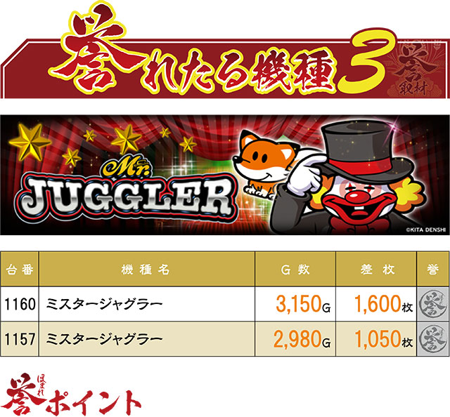 残念ながら2,000枚を上回る結果には出会えなかった『ミスタージャグラー』。言うまでもなくこちらも総ゲーム数が足りてないようで、打ち手の粘り次第で赤誉マークも狙えていただけに非常に勿体ない結果となってしまった。