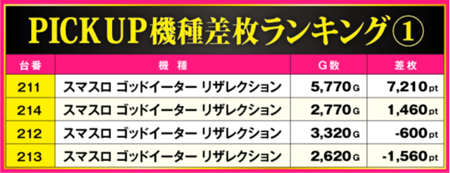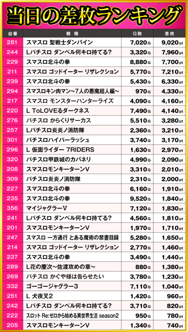 当日の差枚ランキング