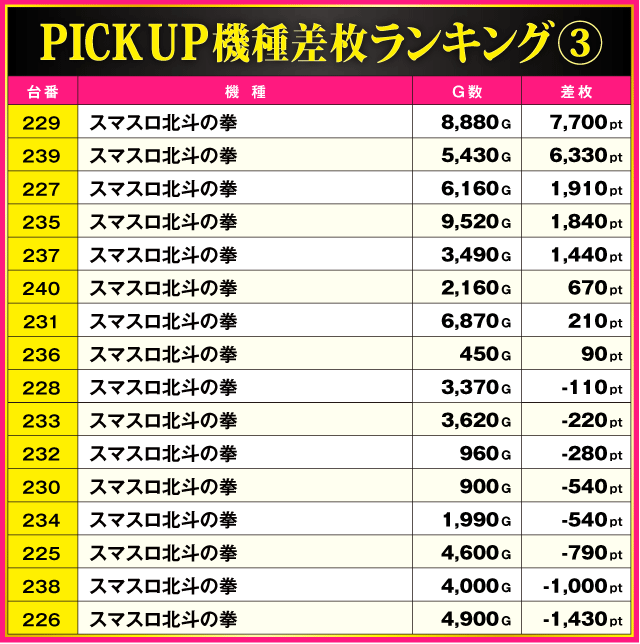 次にPICK UP機種の様子を見てみると、3機種とも半数以上の台がプラス差枚で終了する見事な結果を残している。特に『スマスロ北斗の拳』は、+1,000pt超の台が多数確認されており、いたるところでアツきバトルが繰り広げられていたようだ。