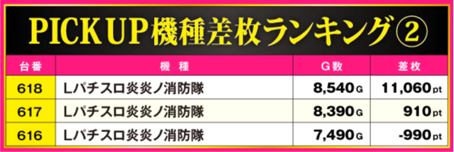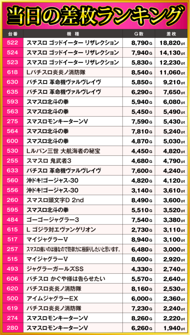 当日の差枚ランキング