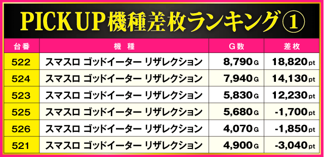 この日はなんといっても『スマスロ ゴッドイーター リザレクション』がアツかった!! ランキングトップに輝いた522番台の+18,820pt以外に万枚超が2台も出現しベスト3を独占する見事な結果を残している。また、その他の機種では『パチスロ 革命機ヴァルヴレイヴ』や『スマスロ北斗の拳』から好成績が連発している。