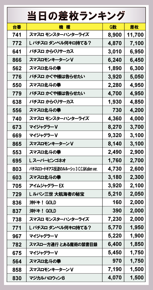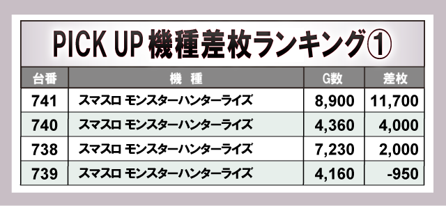『スマスロ モンスターハンターライズ』から万枚OVERが発生。ほかにも『Lパチスロ ダンベル何キロ持てる?』から+7,000枚OVERが飛び出すなど、各所でまとまった出玉を確保しており、店内は大きな熱気に包まれていたことだろう。また回転数をみても、8~9,000回転OVERをマークする台が見受けられ、ファンは打ちごたえのある状況に歓喜していたようだ。