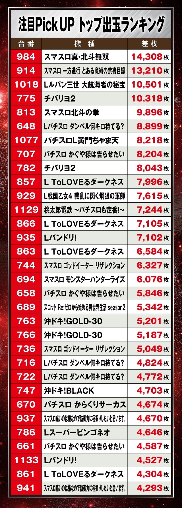 この日は人気のスマスロから万枚超が多数発生!! なかでも『スマスロ真・北斗無双』が+14,308枚を叩き出しランキングトップに輝いた。また、『スマスロ 一方通行 とある魔術の禁書目録』や『Lルパン三世 大航海者の秘宝』といった、比較的新しめの機種からも万枚超が確認されている。
