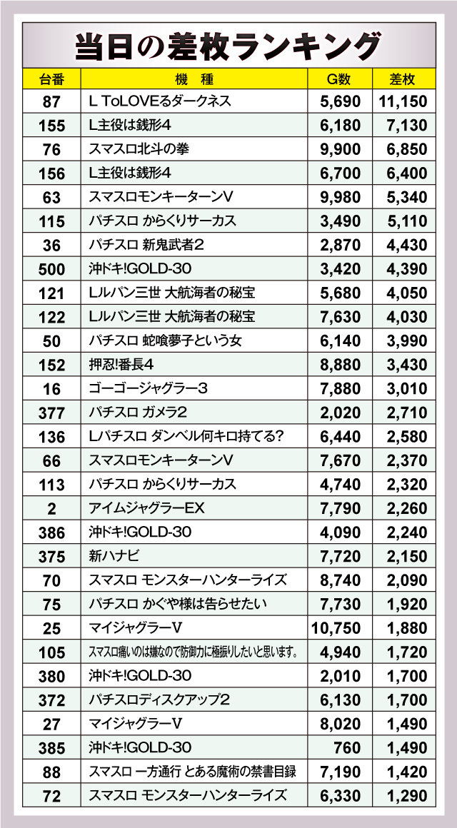 優秀台を見てみると、『L ToLOVEるダークネス』が大台突破の大活躍。87番台が+11,150枚を記録した。かわいい顔して、ここぞという場面では見せてくれる。それに続いたのが『L主役は銭形4』。155番台が+7,130枚、76番台がという結果を残しており、主役に迫った感じだ。『スマスロ北斗の拳』も負けてはいない。76番台が+6,850枚を記録している。今でもスマスロの主人公的ポジションを譲らないのはさすがだ。以下、+5,340枚の『スマスロモンキーターンV』63番台、+5,110枚の『パチスロ からくりサーカス』115番台、+4,430枚の『パチスロ 新鬼武者2』36番台、+4,390枚の『沖ドキ!GOLD-30』500番台、+4,250枚の『Lルパン三世 大航海者の秘宝』121番台、+4,030枚の同122番台と続いた。