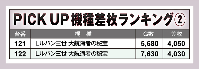 ピックアップ機種では、『スマスロモンキーターンV』が好調。+5,000枚オーバーの63番台を筆頭に、5台中4台がプラスで、合計の差枚数も余裕でプラスだった。人気シリーズの最新機種『Lルパン三世 大航海者の秘宝』も、設置の2台とも+4,000枚オーバーを記録。しかも2台でその差わずか20枚というデッドヒートを繰り広げていたのが印象的だった。