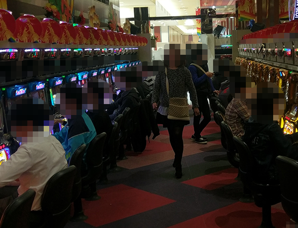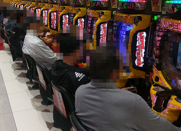 15時頃の20円パチスロをみると、たくさんのプレイヤーが笑みを浮かべており、にぎやかな状況。