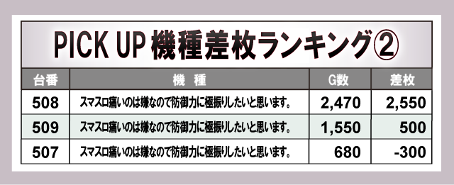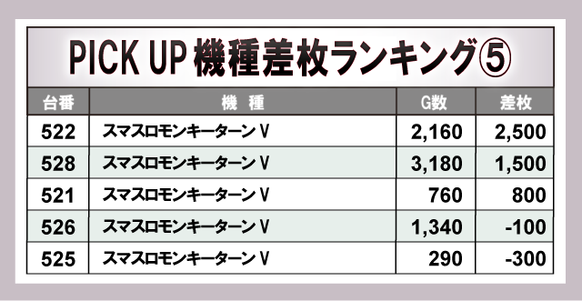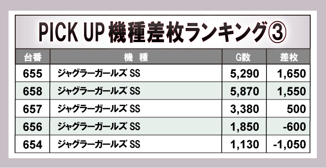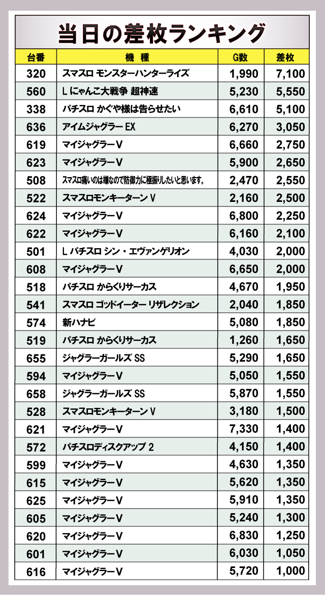 『スマスロ モンスターハンターライズ』から+7,000枚OVERが生まれ、店内の盛り上がりをリード。『パチスロ かぐや様は告らせたい』、そして新台『L にゃんこ大戦争 超神速』から+5,000枚OVERと、打ち込まれていた様子も相まって大きく賑わっていた。また、『ジャグラー』シリーズが多く名を連ねているのもポイントで、ファンは明らかな手応えに恍惚の表情を浮かべていたに違いない。
