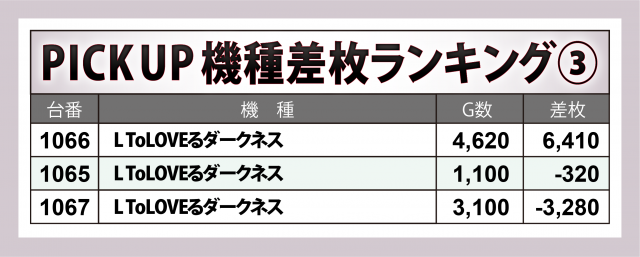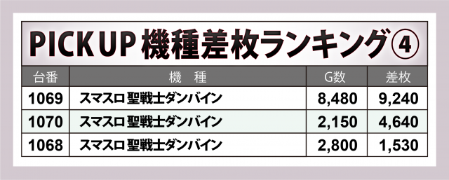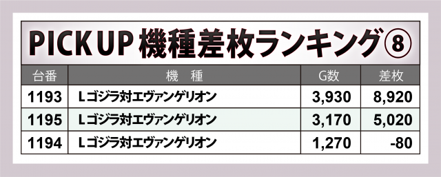 加えて『スマスロ 聖戦士ダンバイン』に+9,200枚超・+4,600枚超が1台ずつ、『L ゴジラ対エヴァンゲリオン』に+8,900枚超・+5,000枚超が1台ずつ、『L ToLOVEるダークネス』に+6,400枚超、『Lパチスロ閃乱カグラ2 SHINOVI MASTER』に+5,000枚弱など、少設置機種にも多くのチャンスが窺えた。