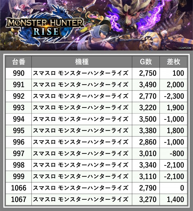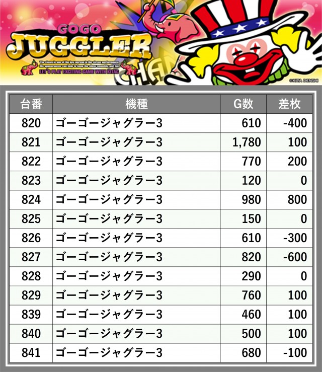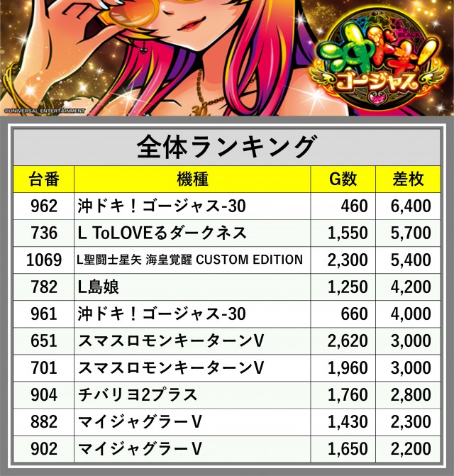 厳選された取材対象機種をはじめ、その他スロット全体から好記録が飛び出した!プレイヤーが楽しんだ1日を下記データにて振り返ってみて欲しい。