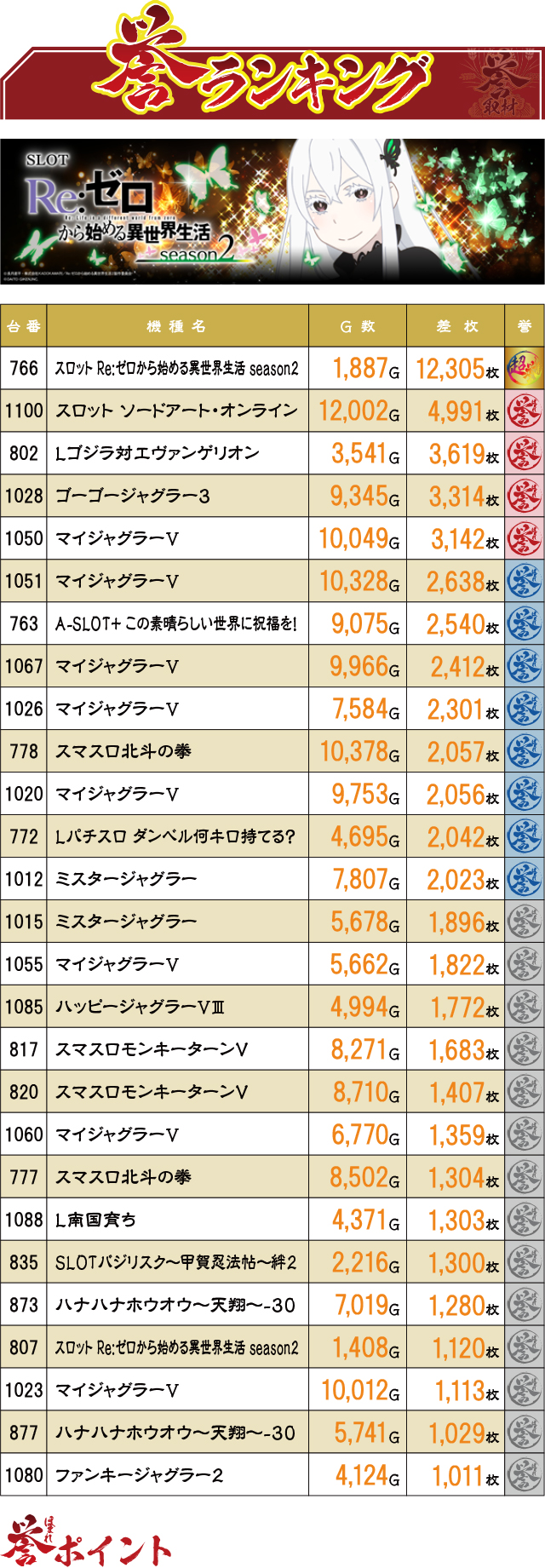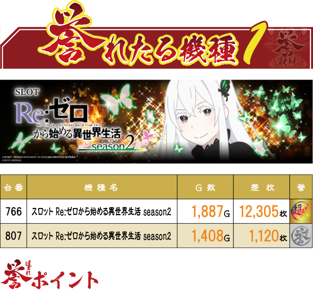 『スロット Re:ゼロから始める異世界生活 season2』が、12,000枚オーバーという猛烈な差枚結果を叩き出し、堂々の首位レコードの座を獲得した。その圧倒的な差枚記録は2位以下を大きく突き放し、その差は7,000枚以上!いかに突出した結果だったのかをうかがわせてくれた。