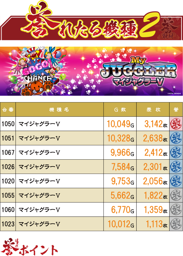 『マイジャグラーⅤ』からは8台もの誉レコード(=1,000枚以上)が誕生!最も好調にGOGOランプをペカらせていた1050番台が3,000枚超えを果たし、同店での最多設置機種としての意地を見せつけた。