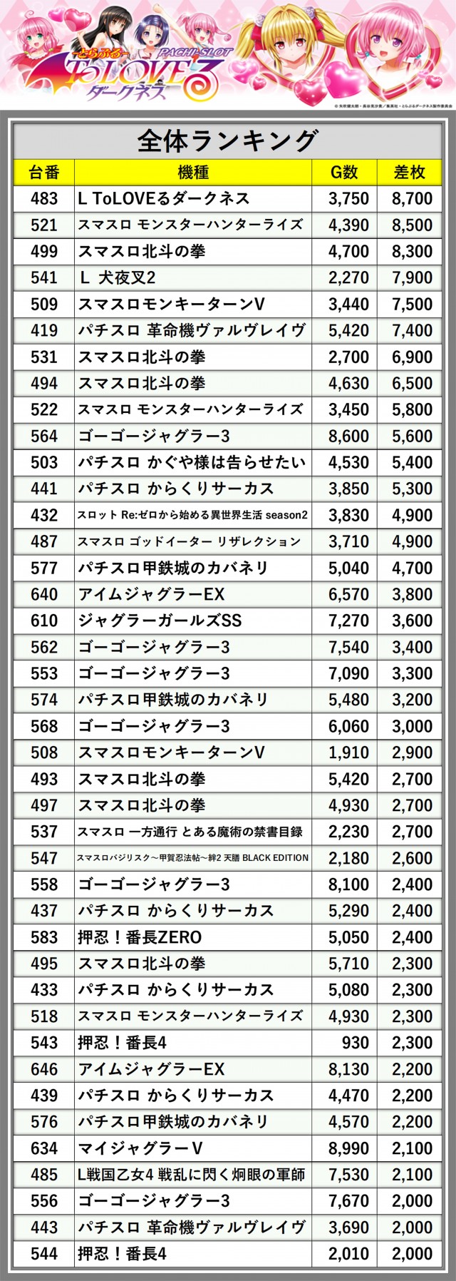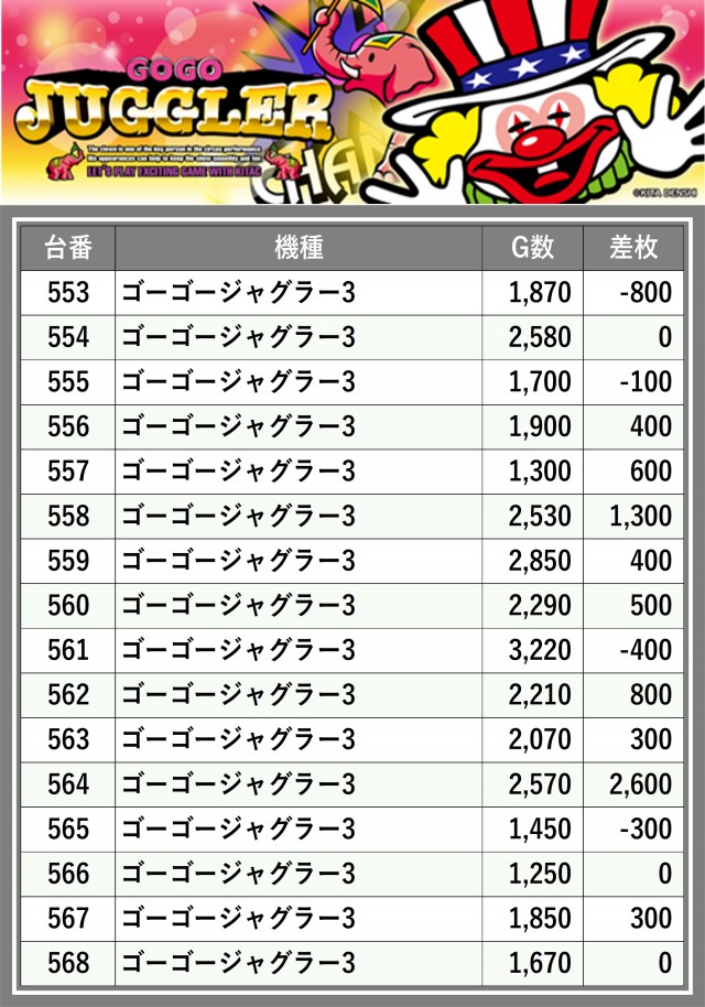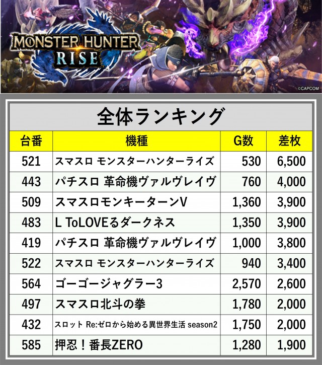 厳選された取材対象機種をはじめ、その他スロット全体から好記録が飛び出した!プレイヤーが楽しんだ1日を下記データにて振り返ってみて欲しい。