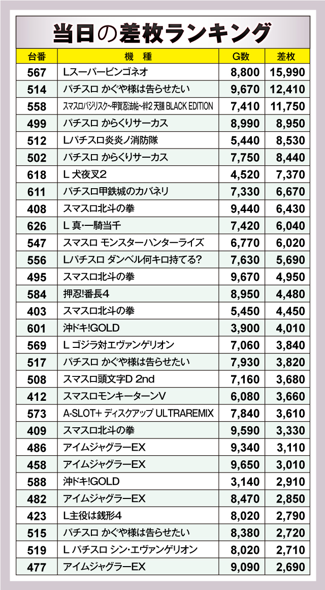 なんとこの日は全スロッターの憧れである万枚達成台が3台もうまれている。『Lスーパービンゴネオ』567番台が+15,990枚。『パチスロ かぐや様は告らせたい』514番台が+12,410枚。『スマスロバジリスク~甲賀忍法帖~絆2 天膳 BLACK EDITION』558番台が+11,750枚と、非常に華々しい差枚が並んだ結果となった。