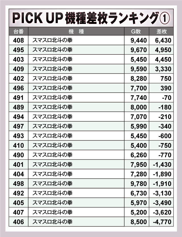 個別に見てみると、全20台がしっかり打ちこまれていた『スマスロ北斗の拳』。G数とくらべて大幅プラス差枚となった台が意外と少なめで、前回ほどの差枚を叩きだすことはできなかった。さすがの人気ATタイプであっても、必ずしも好結果となるわけではない、ということだろう。