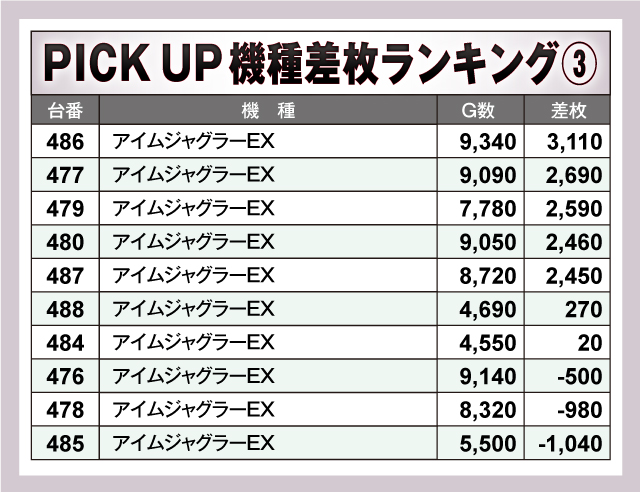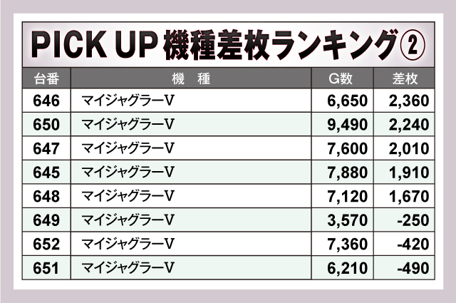 人気の『ジャグラー』シリーズのランキングを見てみると、『マイジャグラーⅤ』と『アイムジャグラーEX』のG数も見事なもの。安定感のあるノーマルタイプだけあり、まわせばまわすほど優秀台の性能を引き出せる、ということを如実に証明している。