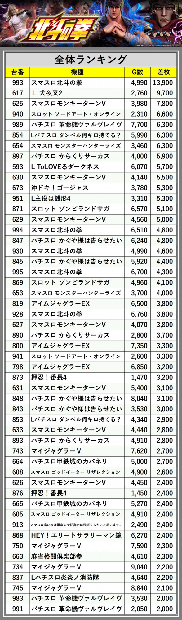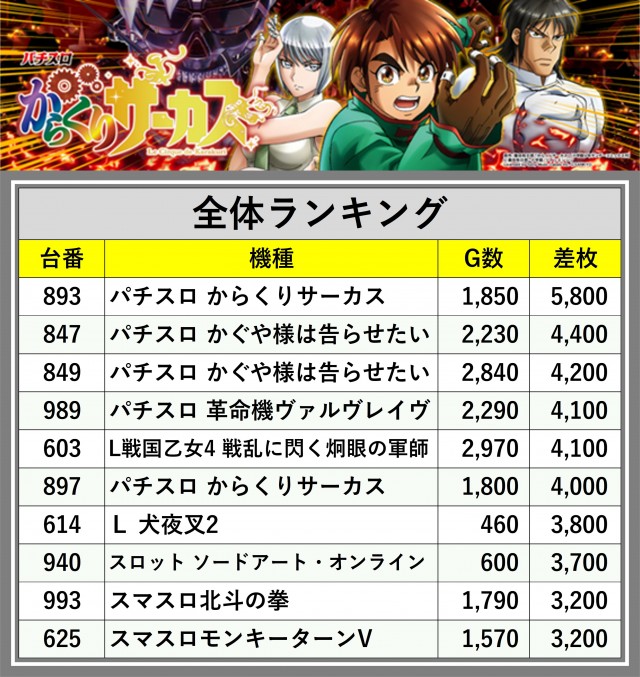 厳選された取材対象機種をはじめ、その他スロット全体から好記録が飛び出した!プレイヤーが楽しんだ1日を下記データにて振り返ってみて欲しい。