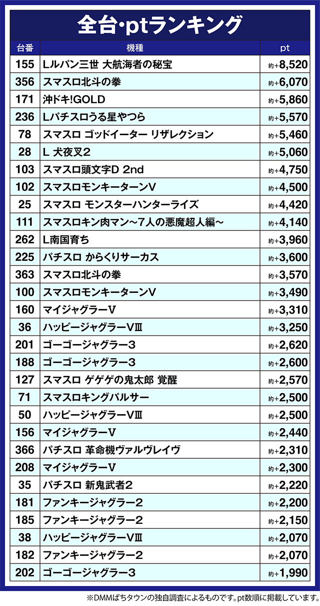 ほかにも、「スマスロ北斗の拳」の356番台が約+6,070pt、「沖ドキ!GOLD」の171番台は約+5,860ptと、結果を残した台は多かった。