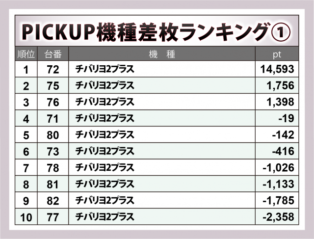 本日のMVPが『チバリヨ2プラス』。プラス台割合はそう高くはなかったが、+14,600枚弱を筆頭に+1,500枚周辺が2台と、大いなる報酬が秘められていた。