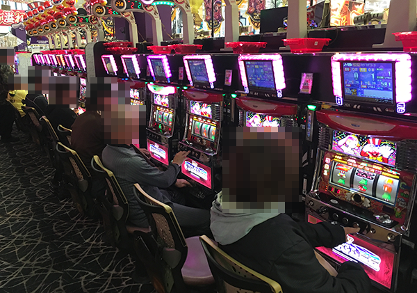 8円パチスロと2.5円パチスロの支持も厚く、空き台はほとんど見当たらない。
