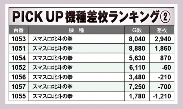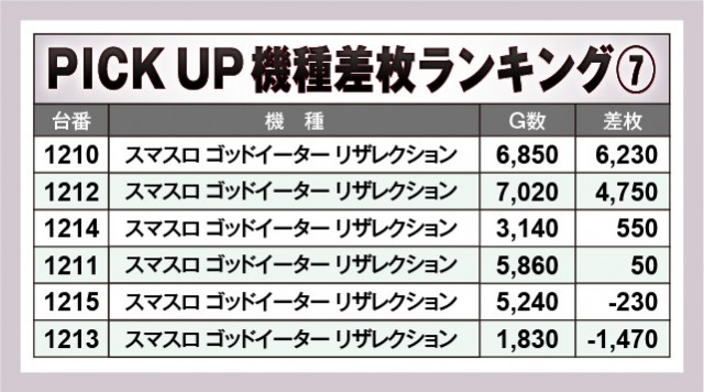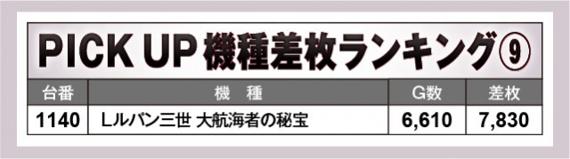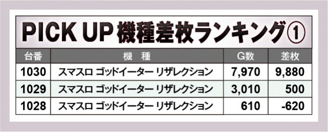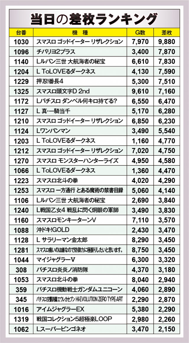 『スマスロ ゴッドイーター リザレクション』にて9,880枚を確認でき、惜しくも万枚を逃した格好だが、店内の盛り上がりを牽引する存在となっていた。そして『チバリヨ2プラス』『Lルパン三世 大航海者の秘宝』などから7,000枚OVERも見られ、店内を包んでいた熱気の高さが窺える。幅広い機種が名を連ねているのも印象的な部分で、ファンは選択肢の多い状況に歓喜していたのではないだろうか。